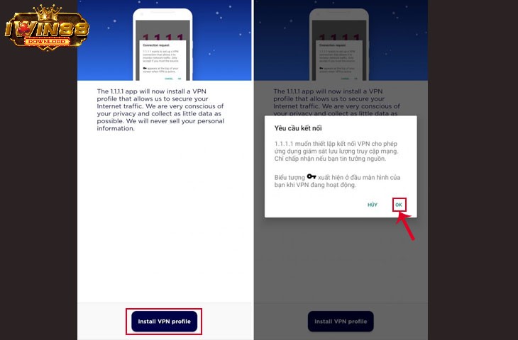 Lưu ý: Đối với lần đầu tiên sử dụng, ứng dụng sẽ hỏi để xin cấp quyền thêm cấu hình VPN. Tại những lần tiếp theo, thông báo này sẽ không hiển thị nữa. Người dùng chỉ cần bấm chọn lệnh Install VPN Profile và click OK là hoàn tất.